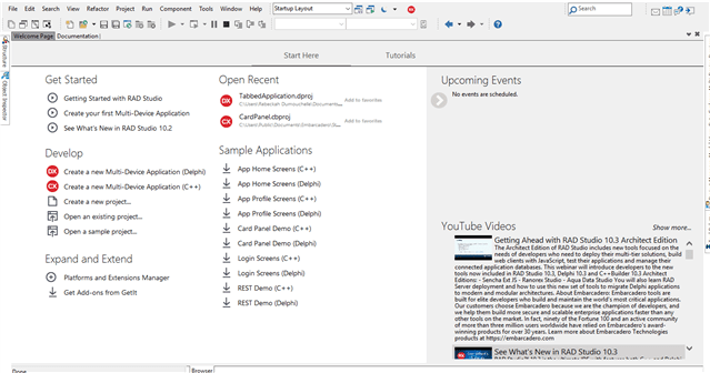 When you start the IDE for the first time, you’ll see several guides presented under “Start Here” tab: Get Started, Guided development projects, Open Recent projects, and Sample Applications you can use. To the right side is a panel that will show upcoming events, if any official Embarcadero events or webinars are planned. Under that will be recent YouTube videos.