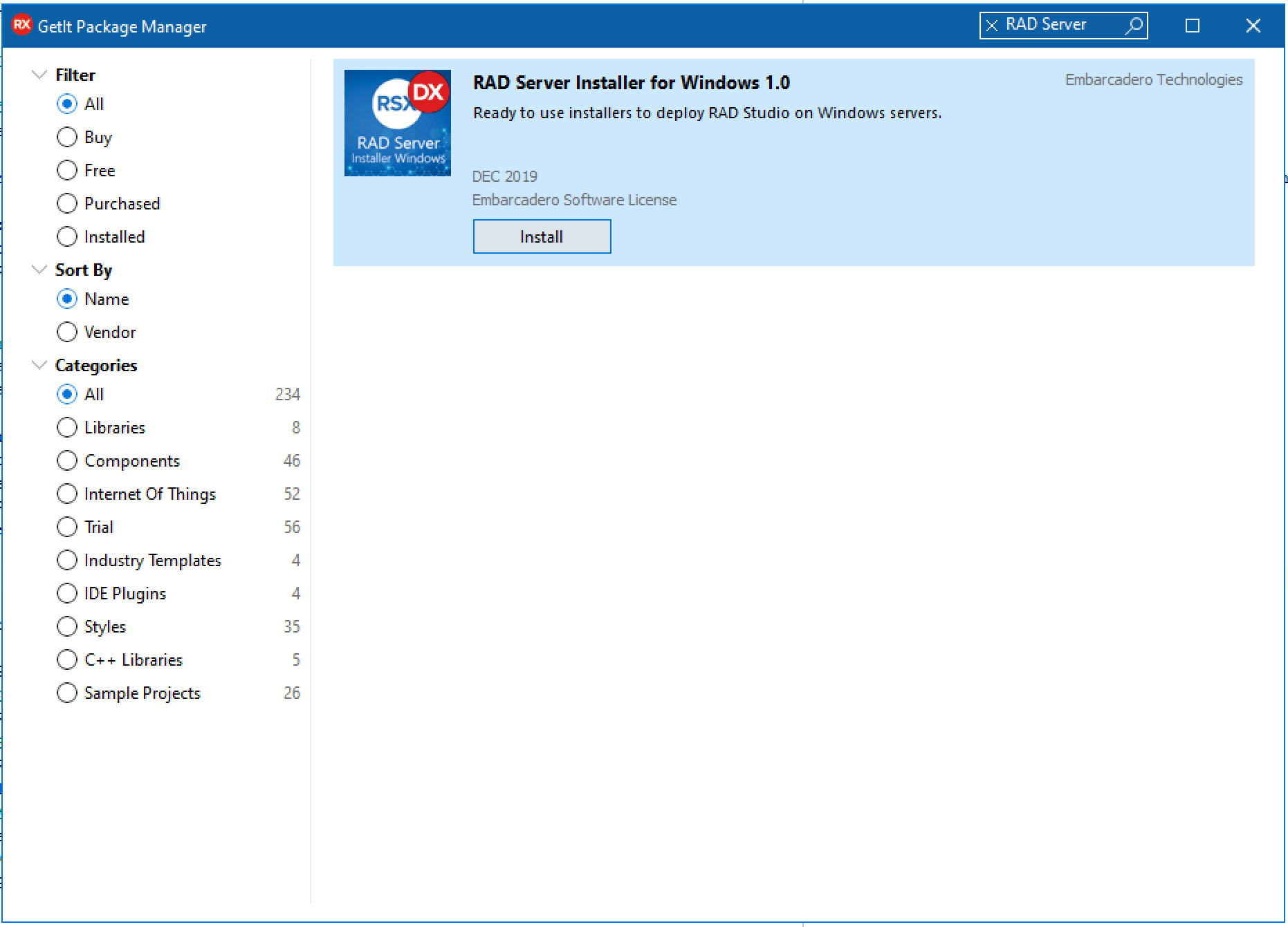 I’m not planning to cover in detail setting up RAD Server in the cloud in this blog. But in short, you can now download an installer to use on Windows or Linux servers via GetIt. (Tools > GetIt Package Manager) – The button Install is a little miss leading as it just downloads it to your local catalog repository. e.g. C:UsersembtDocumentsEmbarcaderoStudio20.0CatalogRepositoryRADServerInstallerforWindows-1033-1.0