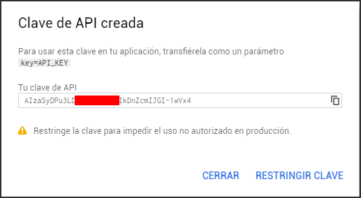 Si el proceso ha sido correcto, aparecerá una ventana como la que se ve a continuación con la clave asignada. Esta clave será la que tendremos que asignar en nuestra aplicación para que pueda usar este servicio de Google.